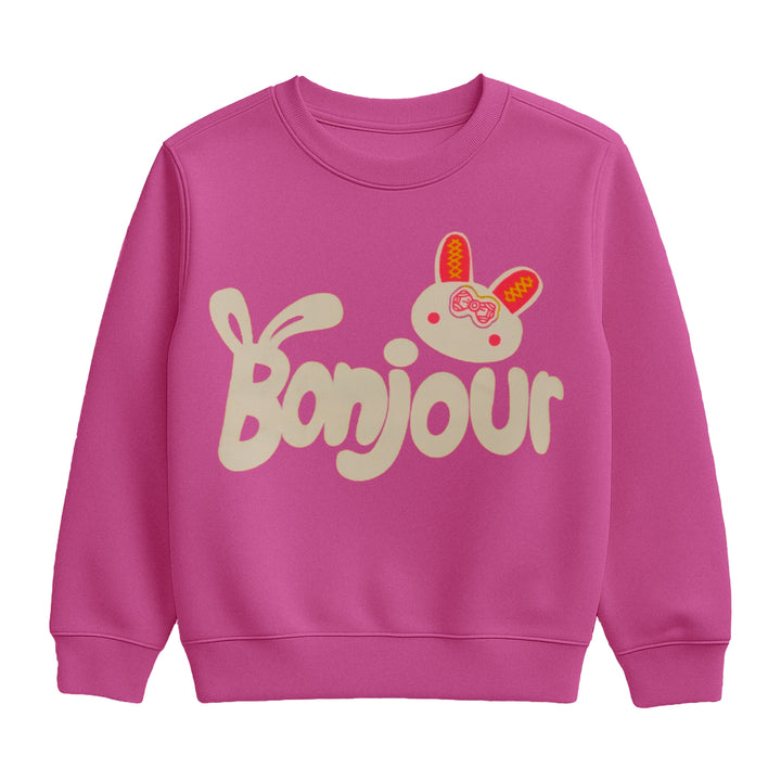 Design: The sweatshirt features a graphic print on the chest with a stylized bunny head and the word "Bonjour" in a cream-colored font. The jogger pants have a smaller matching "Bonjour" design on the leg.