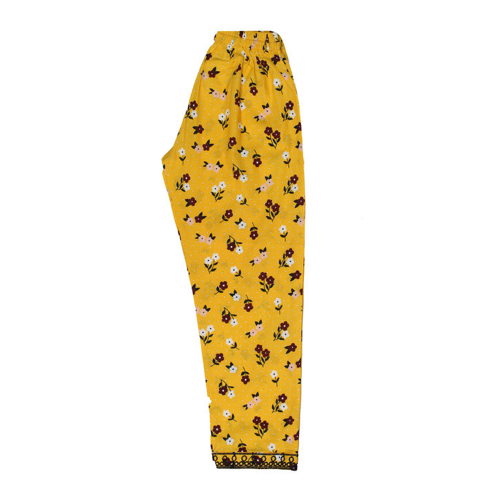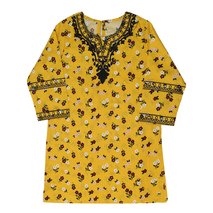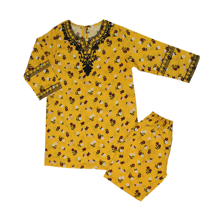 Brighten up your wardrobe with this charming two-piece kids set, featuring a vibrant yellow kurta (tunic) and matching shalwar. Both pieces are adorned with a delightful all-over floral print in shades of white, pink, and burgundy, complemented by subtle white polka dots. The kurta features striking black embroidery around the neckline and on the cuffs, adding an elegant contrast and traditional flair. The shalwar also include a matching black embroidered border at the hem. Made from a comfortable and breathable fabric, this set is ideal for daily wear, casual outings, or adding a pop of color to your ethnic collection. The relaxed fit ensures comfort and style.