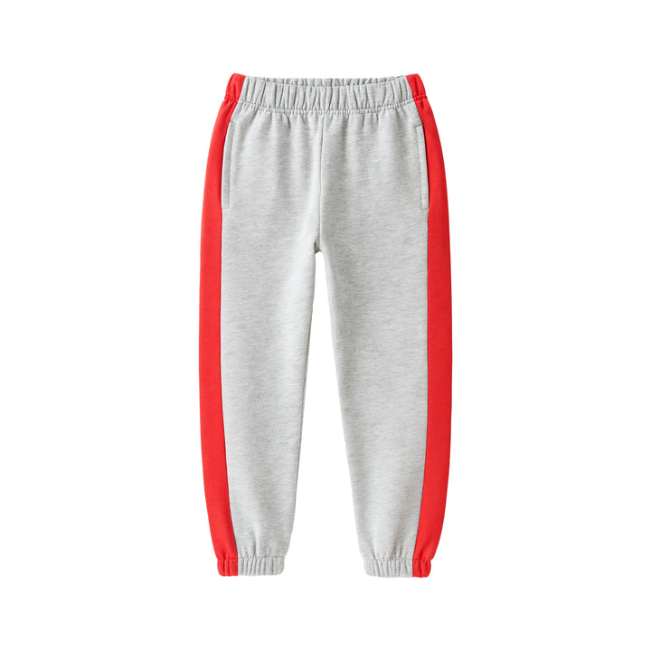 These sporty jogger pants combine comfort with an athletic edge. Crafted in a soft grey fabric, they feature bold red side stripes that add a vibrant pop of color and a trendy look. Designed with an elastic waistband, side pockets, and cuffed ankles, they ensure a secure and comfortable fit for active kids. Perfect for school, playtime, or casual outings, these joggers offer both durability and style, making them a versatile wardrobe essential.