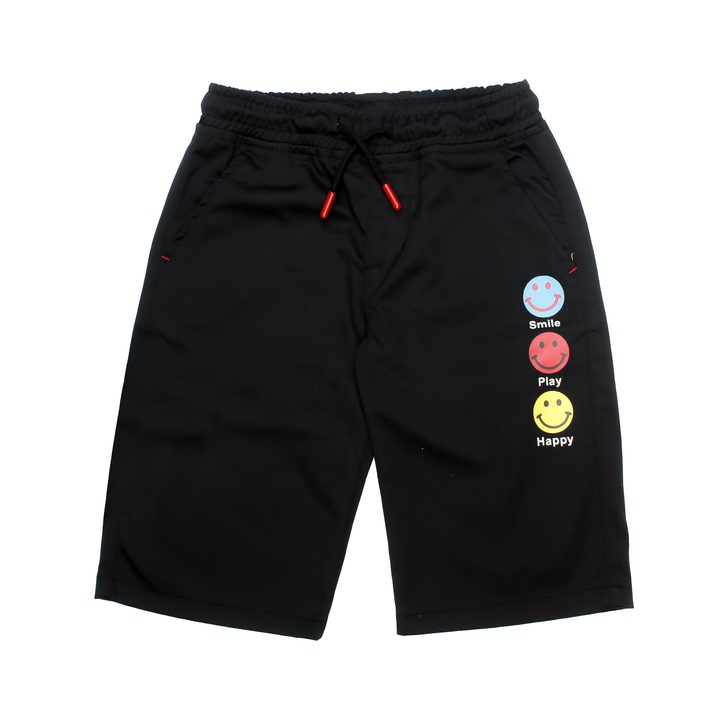 These boys' black shorts are designed for comfort and playful style. They feature an elastic waistband with an adjustable drawstring for a snug fit. A distinctive graphic print runs vertically down the left leg, showcasing three colorful smiley face emojis in blue, red, and yellow, each accompanied by a word: "Smile," "Play," and "Happy." These soft and breathable shorts are perfect for casual wear, playdates, and everyday adventures, offering a fun and comfortable option for active boys.