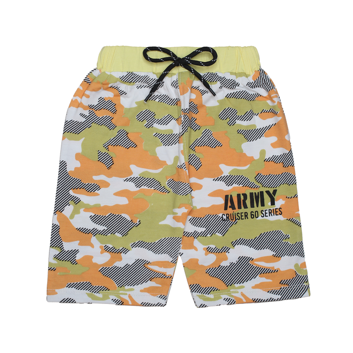 Gear up your little one for adventure with this stylish and comfortable two-piece set! The set features a soft, peach-colored sleeveless t-shirt with a bold "PROUD ARMY" graphic print, celebrating courage and strength. The matching shorts boast a vibrant and playful camouflage pattern in shades of lime green, coral, and white, with black striped accents. The shorts also feature a comfortable elastic waistband with a contrasting black drawstring and "ARMY CRUISER 60 SERIES" text. Perfect for warm weather, playtime, or casual outings, this set combines a cool army-inspired look with ultimate comfort for your young explorer.