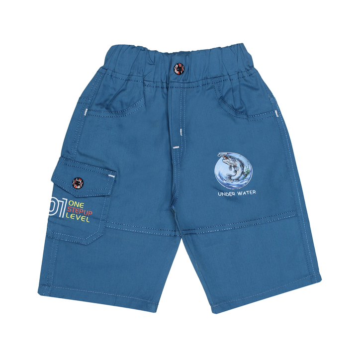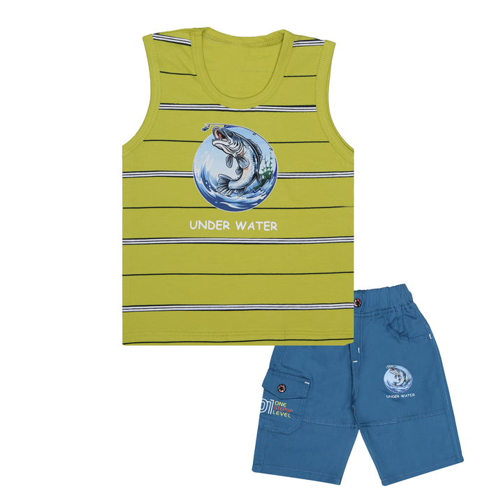Dive into summer fun with this adventurous two-piece set for boys! The set features a sunny yellow sleeveless t-shirt with thin white and blue horizontal stripes. The tee is adorned with a captivating circular graphic of a fish leaping out of the water, with "UNDER WATER" text printed beneath it. The coordinating blue cargo shorts are both practical and stylish, featuring a small matching "UNDER WATER" fish graphic on one leg and a "ONE STEP UP LEVEL" design with a circular logo on the cargo pocket of the other leg. The shorts have an elastic waistband for comfort and a button closure, along with practical pockets. Perfect for a day at the beach, a fishing trip, or simply enjoying the outdoors, this set combines a love for aquatic adventures with comfortable and functional style.