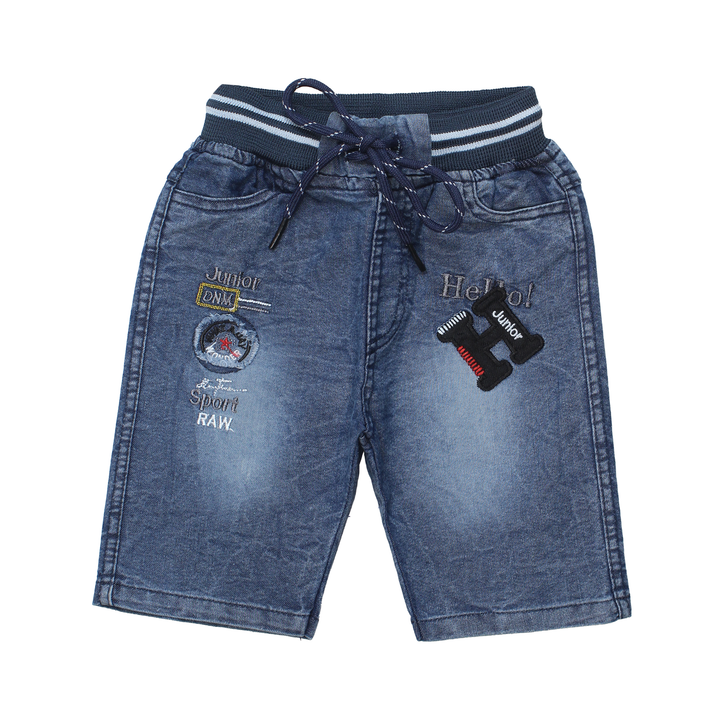 The coordinating denim shorts are a medium wash with a distressed appearance, adding to the urban aesthetic. They feature a comfortable elastic waistband with blue and white stripes and an adjustable drawstring for a perfect fit. The shorts are embellished with various cool graphics and patches, including "Junior DNM" with a circular logo, "Sport RAW," and a black embroidered "H" with "Hello!" and "Junior" text.