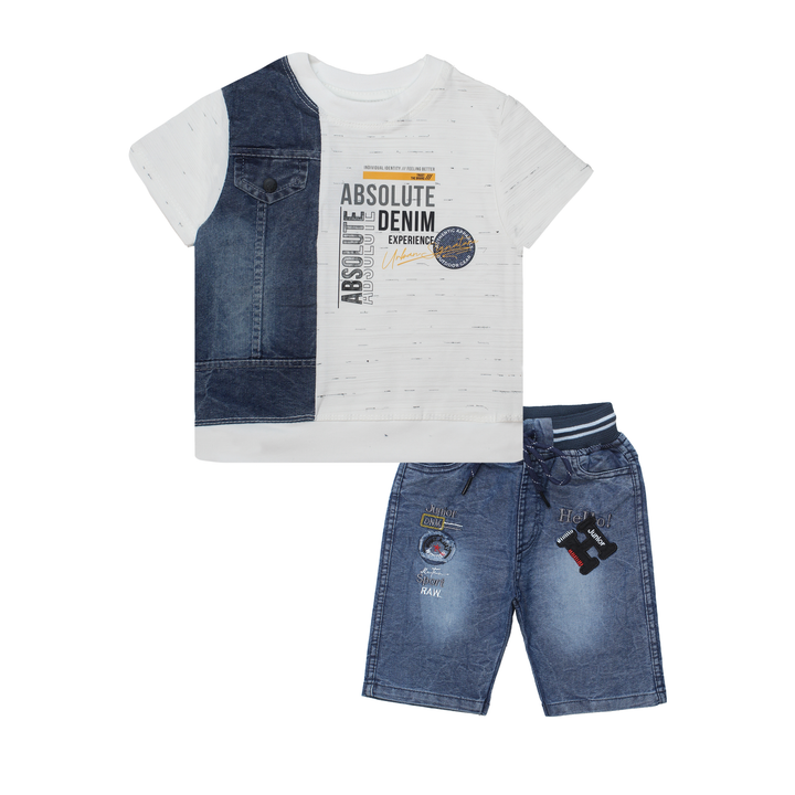 The set includes a white short-sleeve t-shirt with a modern, artistic design. A prominent feature is the dark wash denim panel on the left side, resembling a pocket, creating a trendy patchwork effect. The front of the shirt displays the words "ABSOLUTE DENIM EXPERIENCE" in a bold font, along with abstract graphics and textures that give it an edgy vibe. The "ABSOLUTE" text is also repeated vertically along the denim panel.