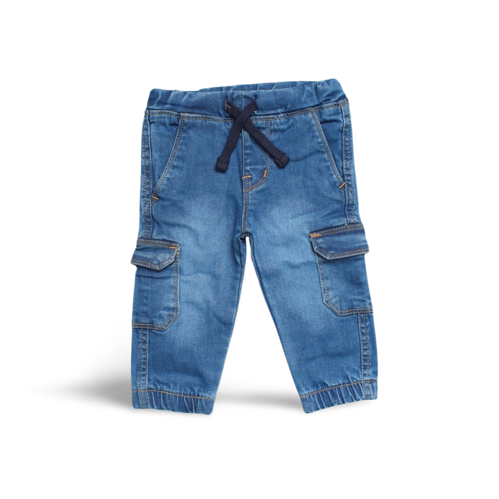 These adorable baby cargo pants combine style with functionality. Made from soft and durable denim, they feature a comfortable elastic waistband with a navy blue drawstring for an adjustable fit. The design includes two side pockets and two cargo pockets with flaps, giving them a practical yet playful look. The elastic cuffs provide a snug and secure fit around the ankles, ensuring comfort and ease of movement for little adventurers. The medium blue denim and visible stitching details enhance the rugged charm, making these pants perfect for casual outings or everyday wear!