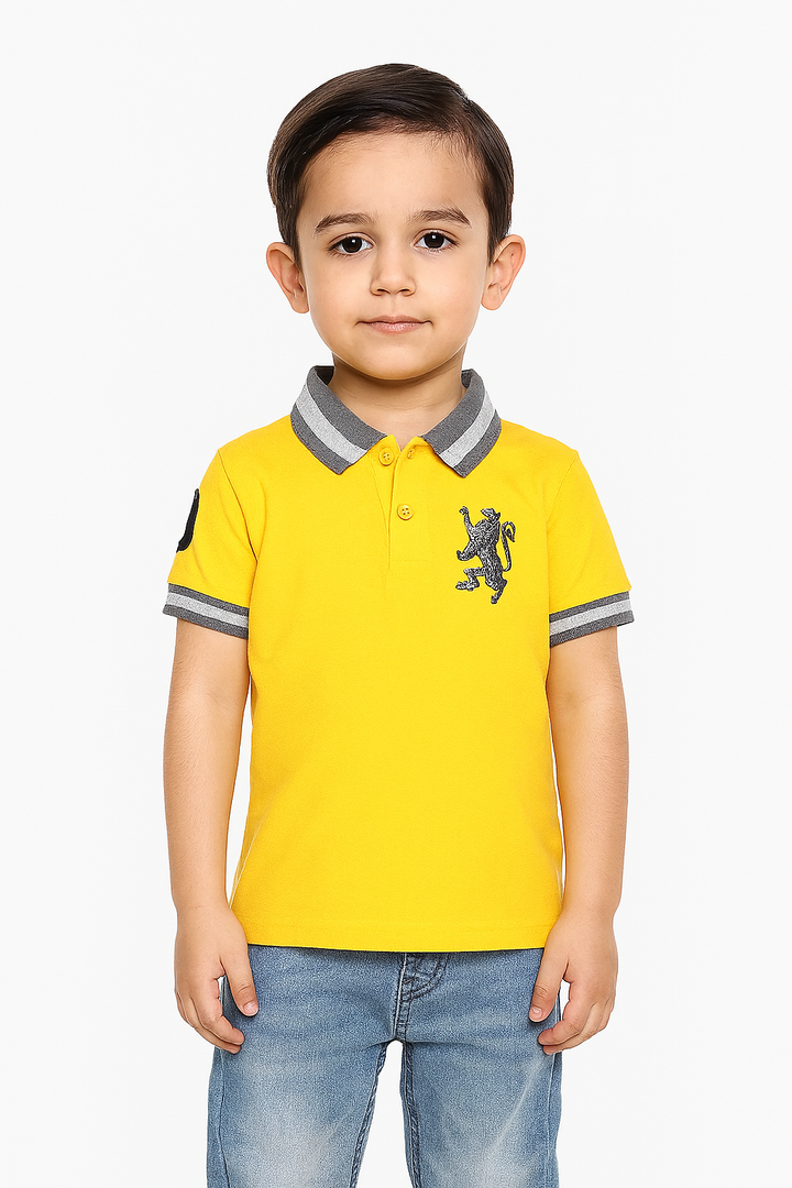 Give your little one a touch of regal charm with the Lion Crest Kids' Polo Shirt! This vibrant yellow polo is designed for both style and comfort, featuring a grey and white striped collar and matching sleeve cuffs for a sporty contrast. The embroidered lion emblem on the left chest adds a bold, majestic detail, perfect for kids who love adventure. A classic three-button placket ensures easy wear, while the soft fabric keeps them feeling comfortable throughout the day. Whether for casual outings or playful moments, this polo shirt brings a blend of fun and functionality to your child's wardrobe!