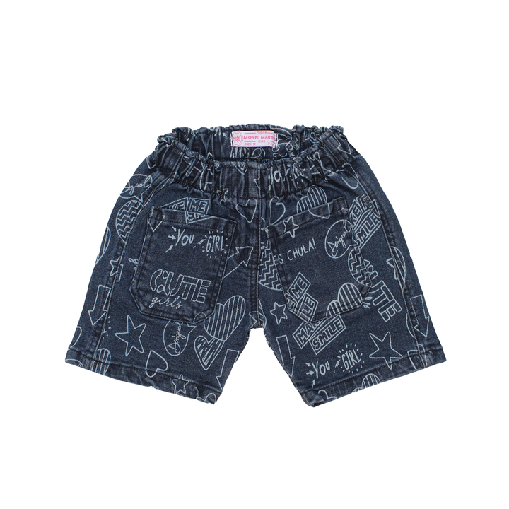 Add a fun and trendy touch to her wardrobe with these girls' denim play shorts featuring a playful allover print. These dark wash shorts are designed for comfort with a fully elasticated, ruffled waistband, ensuring a secure and easy fit. The white outline print includes various cute motifs like hearts, stars, arrows, and phrases such as "You Girl," "CUTE girls," and "SMILE," creating a lively and stylish look. Made from durable denim, these shorts are perfect for casual wear, playdates, and everyday adventures, offering both comfort and unique style.