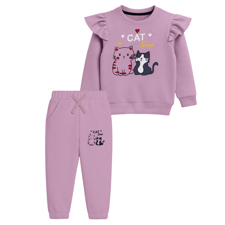 Make your little one’s style extra adorable with this “Cat Shop” Sweatshirt & Jogger Set. Featuring playful kitten graphics and girly ruffle details, this outfit is perfect for comfort and cuteness combined.
