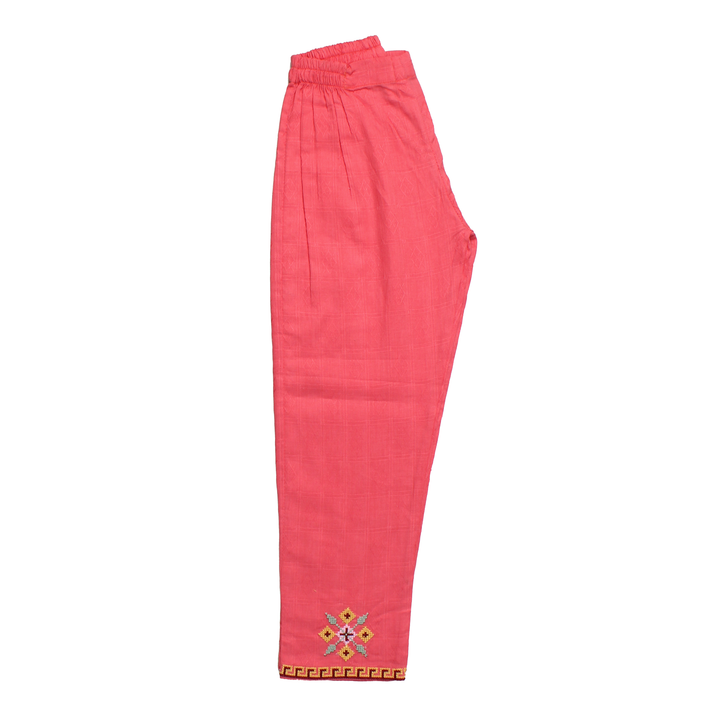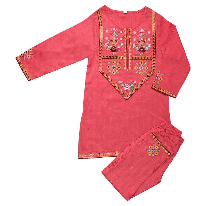 This delightful two-piece suit for girls features a soft peach-colored fabric, perfect for a cheerful look. The kurta (tunic) is beautifully adorned with intricate embroidery in shades of yellow, red, and white, forming striking geometric and floral patterns around the neckline, extending down the front, and on the sleeves. A distinctive Greek key-inspired border elegantly frames the embroidered areas and cuffs. The kurta has a classic round neck with a small V-split. The accompanying shalwar matches the kurta's fabric and features coordinating embroidery and the same stylish border detail at the ankle, ensuring a cohesive and charming ensemble. This suit is ideal for festive occasions, cultural celebrations, or simply adding a touch of traditional grace to a young girl's wardrobe.