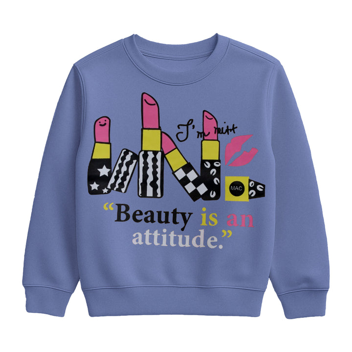 Top: Crew-neck sweatshirt with colorful lipstick print graphics and the empowering slogan “Beauty is an attitude.”