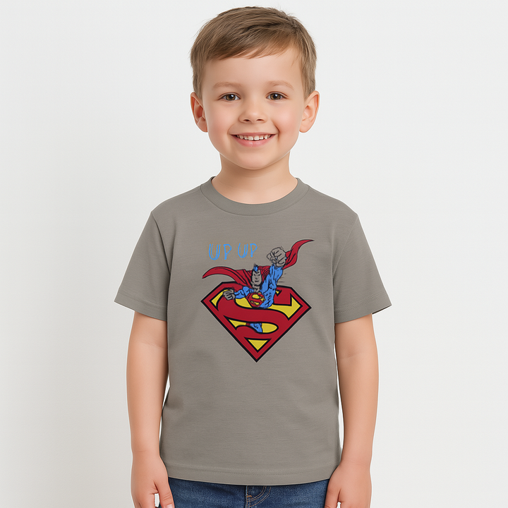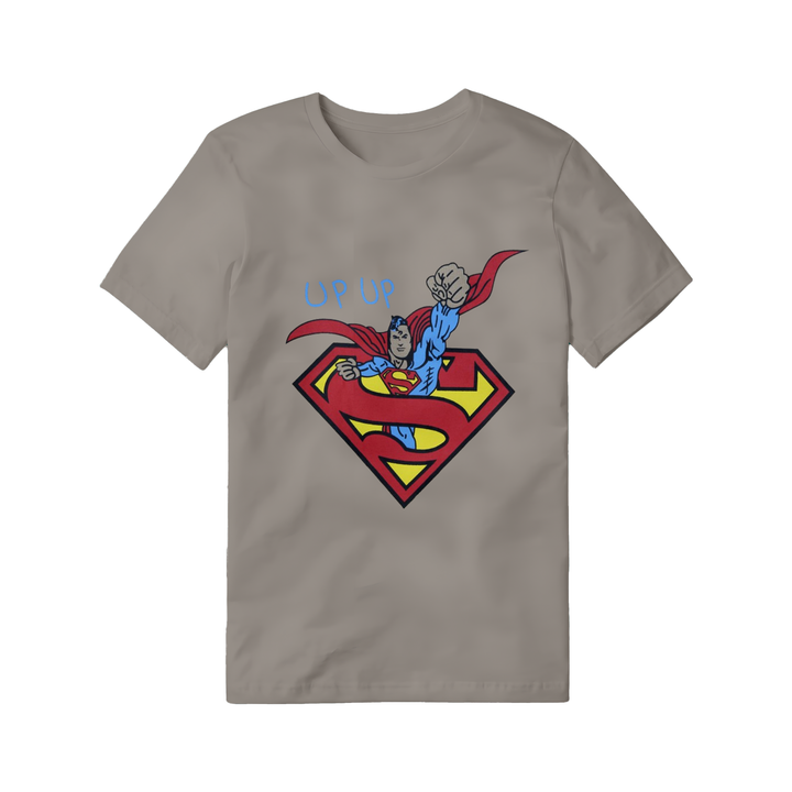 Design: Dynamic illustration of Superman flying out of his "S" shield emblem with "UP UP" text.