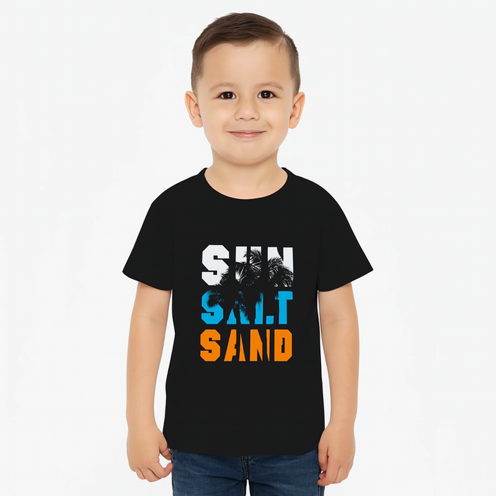 Embrace the tropical vibes with this Sun Salt Sand T-Shirt! This stylish black tee showcases a bold, beach-inspired design with the words "SUN," "SALT," and "SAND" stacked vertically. The word "SUN" is accented with a white palm tree silhouette, while "SALT" pops in a bright blue hue and "SAND" glows in warm orange, evoking the perfect beach sunset. Crafted from high-quality fabric, this t-shirt ensures a comfortable fit and lasting durability, making it an ideal choice for summer outings, vacations, or everyday casual wear. Get ready to bring the ocean breeze wherever you go!