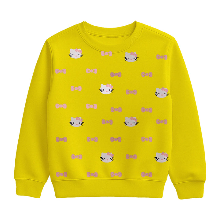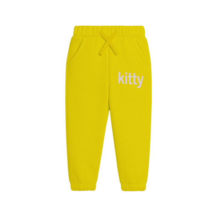This sweet two-piece set is a bright yellow color. The long-sleeve sweatshirt is covered in a scattered pattern of cartoon kitty faces with pink bows and alternating pink bows without the faces. The matching jogger pants have the word "kitty" printed on the left leg in a light, creamy font. The pants also include an elastic waistband with a tie and ribbed cuffs at the ankles. This comfortable and charming set is great for any cat lover.