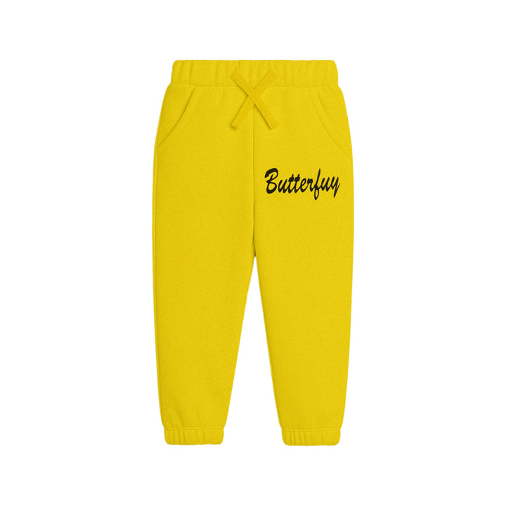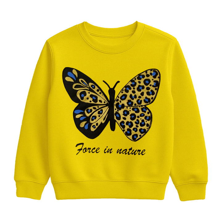 This is a bright two-piece set in a cheerful yellow color. The sweatshirt features a striking graphic of a large butterfly with one wing designed in a blue and black pattern and the other in a black and blue leopard print. Below the butterfly, the phrase "Force in nature" is written in a cursive font. The matching jogger pants have the word "Butterfly" printed on one leg in a similar cursive style. The pants have a comfortable elastic waistband with a tie and ribbed cuffs at the ankles.