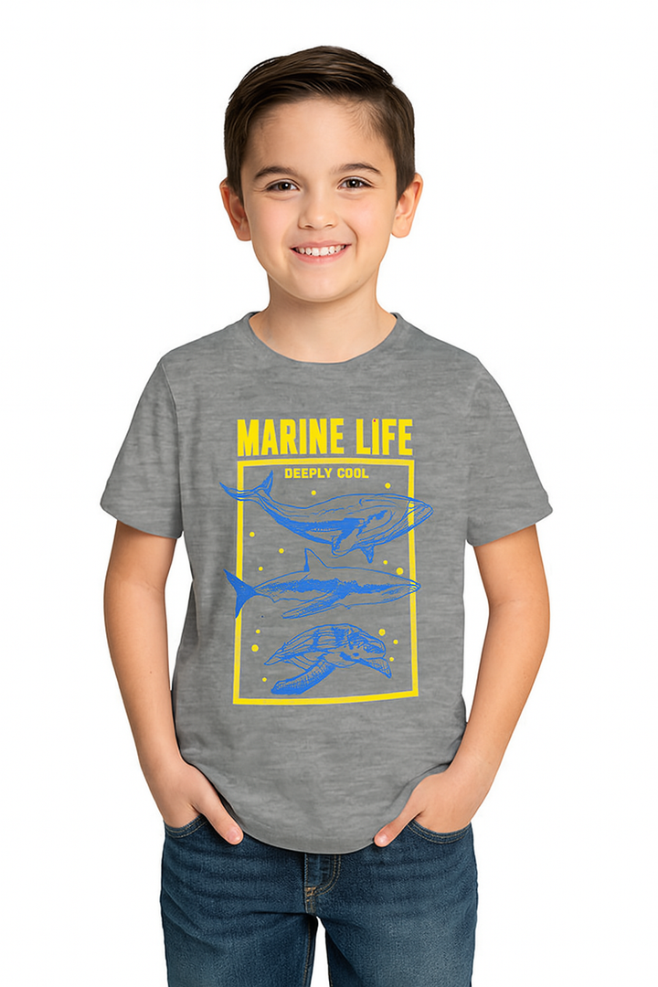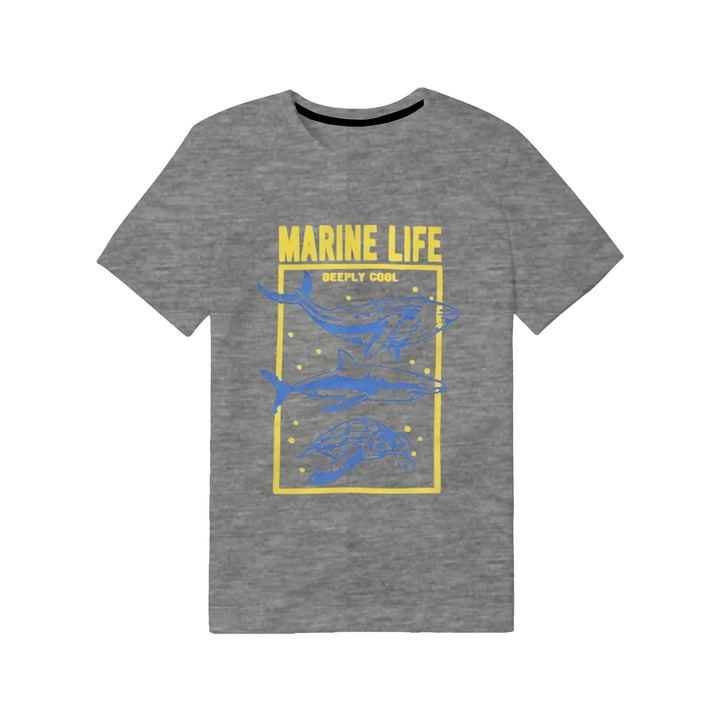 The eye-catching marine animal illustrations stand out against the soft gray fabric, creating a fun and educational look. Made from comfortable material, this short-sleeved t-shirt is ideal for everyday wear, exploring the outdoors, or showing off their love for the ocean's creatures.