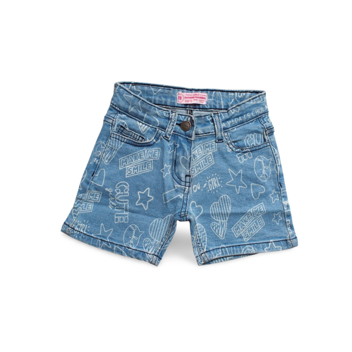 These are kids' blue denim shorts adorned with an all-over white print. The print consists of various elements including hearts, stars, smiley faces, and phrases such as "SMILE", "CUTE girls", and "MAKE ME SMILE". The shorts are designed with a button closure and include belt loops.