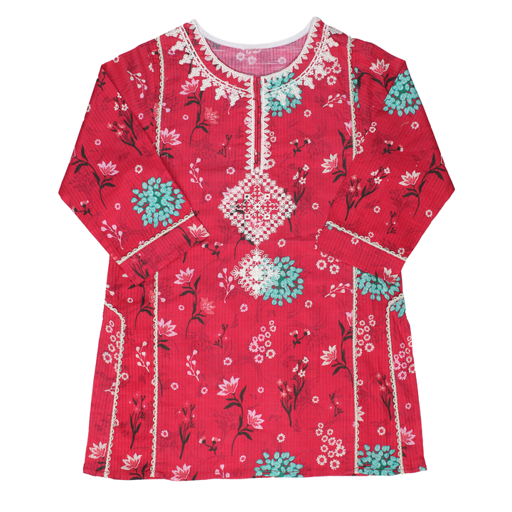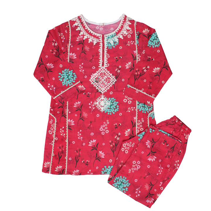 Step out in vibrant style with this captivating two-piece kids suit, featuring a beautiful reddish-pink kurta (tunic) and matching straight-cut trousers. Both pieces are adorned with an all-over delightful floral print in shades of white, teal, and darker pink, with subtle vertical stripes adding texture. The kurta is elegantly detailed with white lace trim along the neckline, placket, and around rectangular accent panels on the front. A central embroidered diamond motif in white and blue adds a touch of intricate design. The cuffs of the 3/4 length sleeves also feature coordinating white lace trim. The trousers are finished with similar lace detailing. Crafted from a comfortable and breathable fabric, this set is perfect for casual outings, daytime events, or adding a cheerful and stylish touch to your ethnic collection. The relaxed fit ensures both comfort and a fashionable look.