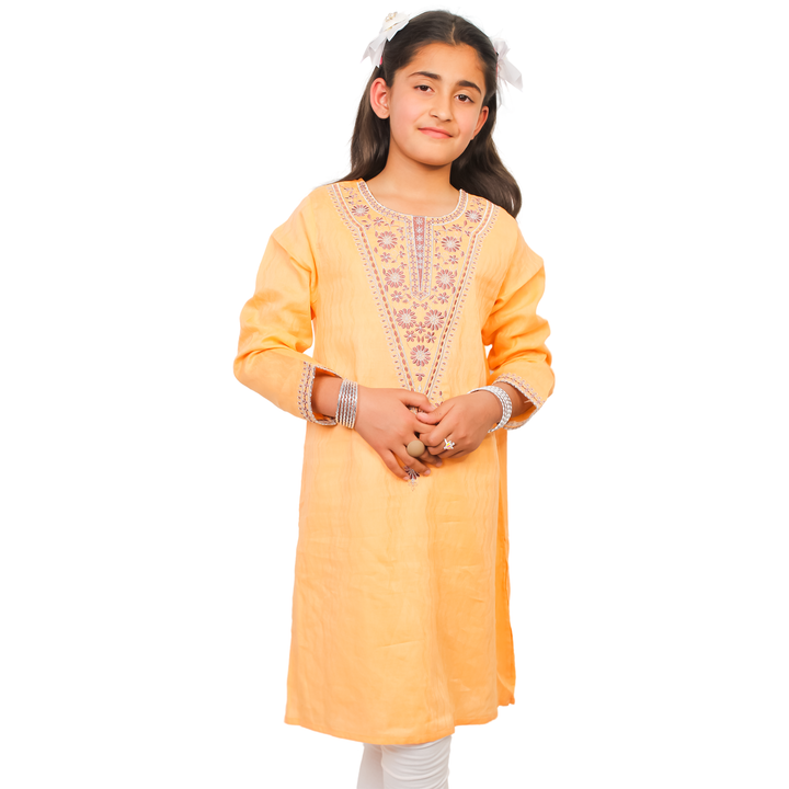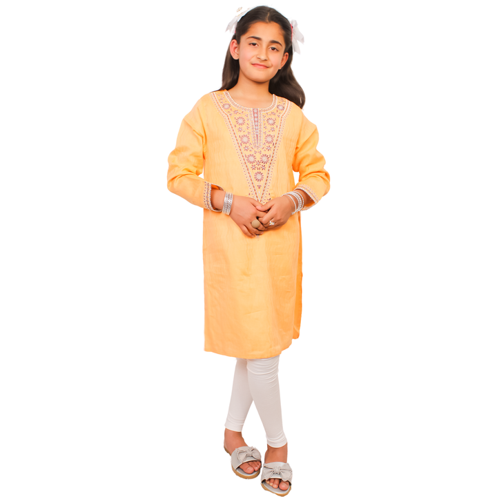 This lovely peach-colored kurti for girls features delicate embroidery around the neckline and cuffs. The soft hue and subtle detailing make it a charming and comfortable choice for everyday wear or special occasions.