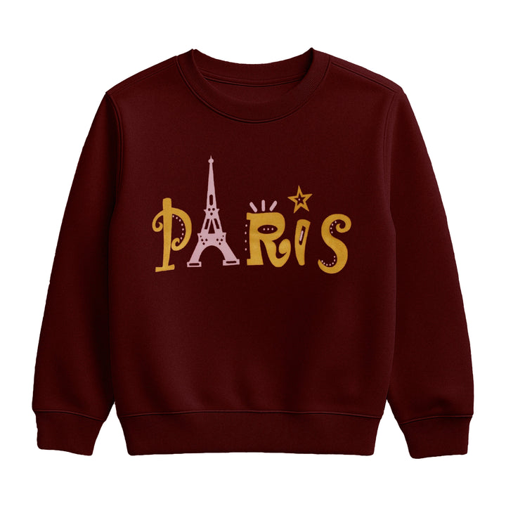 This is a comfortable and stylish two-piece loungewear set for children. It features a rich maroon or burgundy color. The set includes a long-sleeve sweatshirt and matching sweatpants. Both pieces are decorated with a "PARIS" graphic, where the letter 'A' is replaced by a stylized Eiffel Tower and some of the other letters are decorated with stars. The jogger pants have a ribbed ankle cuff and a drawstring waist. The overall design is playful and perfect for casual wear, whether at home or out and about.