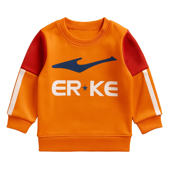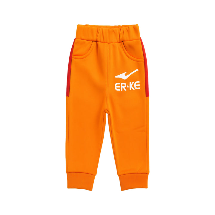 This is a vibrant, two-piece children's tracksuit from the brand ERKE. The set includes a long-sleeve sweatshirt and matching pants, both in a bright orange color. The sweatshirt features a red color-block design on the shoulders and a prominent white and blue ERKE logo and brand name across the chest. The sleeves have two white stripes running down the sides. The matching track pants have a comfortable elastic waistband and pockets, with a red stripe detail on the side and a smaller white ERKE logo printed on one leg. This athletic set is ideal for sports, casual wear, or comfortable everyday use.