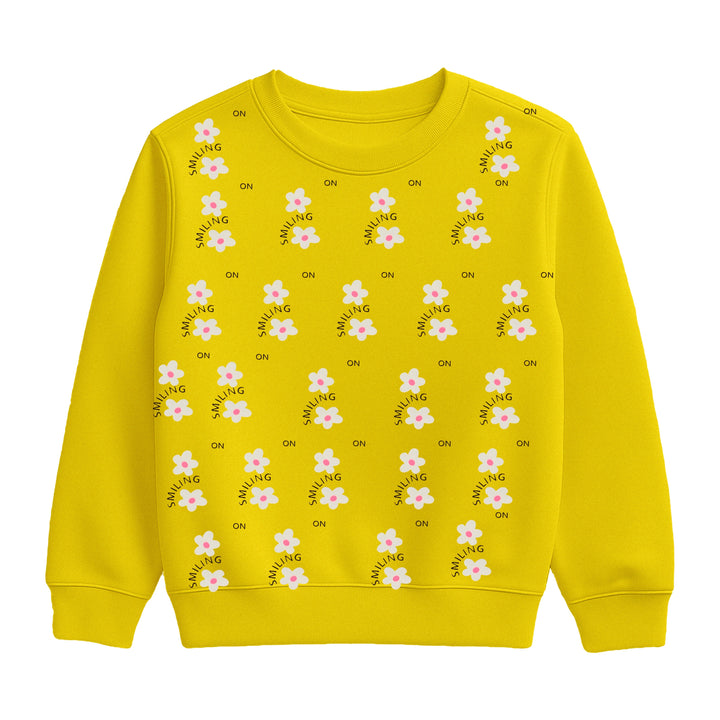 This vibrant two-piece children's set comes in a cheerful yellow color. The sweatshirt is covered in a repeating pattern of white and pink flowers with the words "ON SMILING" in a similar color. The coordinating jogger pants feature a single large flower graphic and the phrase "KEEP SMILING" on the left leg. The pants have a comfortable elastic waistband with a tie and a relaxed fit. This set is perfect for adding a bright, positive touch to any day.