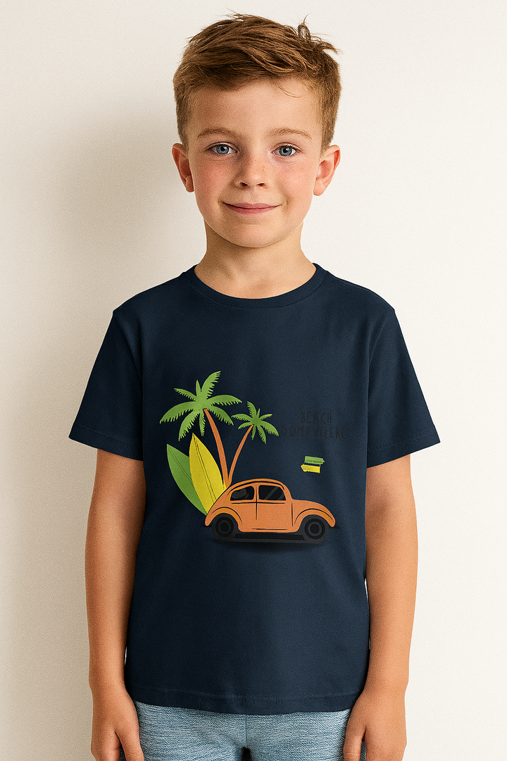 Hit the road to relaxation with our "Navy Beach Cruiser" T-Shirt! This cool navy blue tee features a classic illustration of a vintage car, likely a Volkswagen Beetle, parked under two palm trees with surfboards leaning against them, ready for the water. The phrase "CATCH SOME WAVES" subtly reinforces the laid-back, surf-ready theme. This comfortable and stylish t-shirt is perfect for anyone who loves the beach, vintage vehicles, or the surfing lifestyle. It's an ideal choice for casual wear, summer outings, or dreaming of your next coastal adventure.