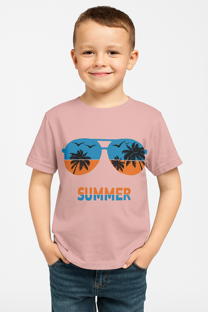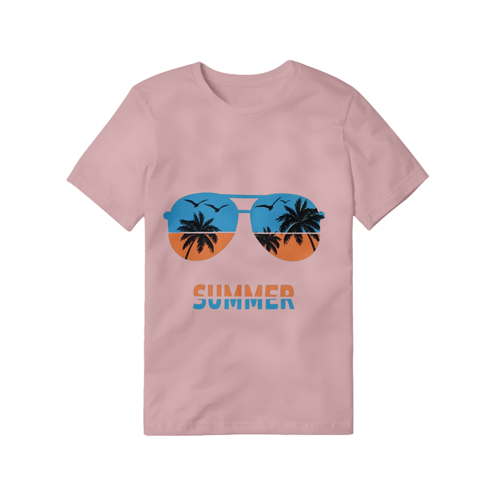 This pale pink t-shirt features a graphic of sunglasses with a vibrant, split-color reflection: the top half shows a blue sky with birds, and the bottom half an orange sunset over palm trees, evoking a beach or tropical scene. Below the sunglasses, the word "SUMMER" is printed in a blocky, distressed font. This tee is perfect for anyone looking to capture a relaxed, summery, and vacation-ready mood.