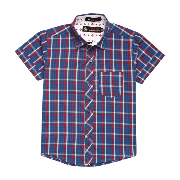 This short-sleeved, button-up shirt features a bold checkered pattern in vibrant colors. Designed with a classic collar and a front pocket on the left side, it exudes a timeless, casual elegance. The central button-down closure adds to its refined yet relaxed appeal. The label inside the collar proudly displays "Polo by Ralph Lauren," signaling premium craftsmanship and style.
