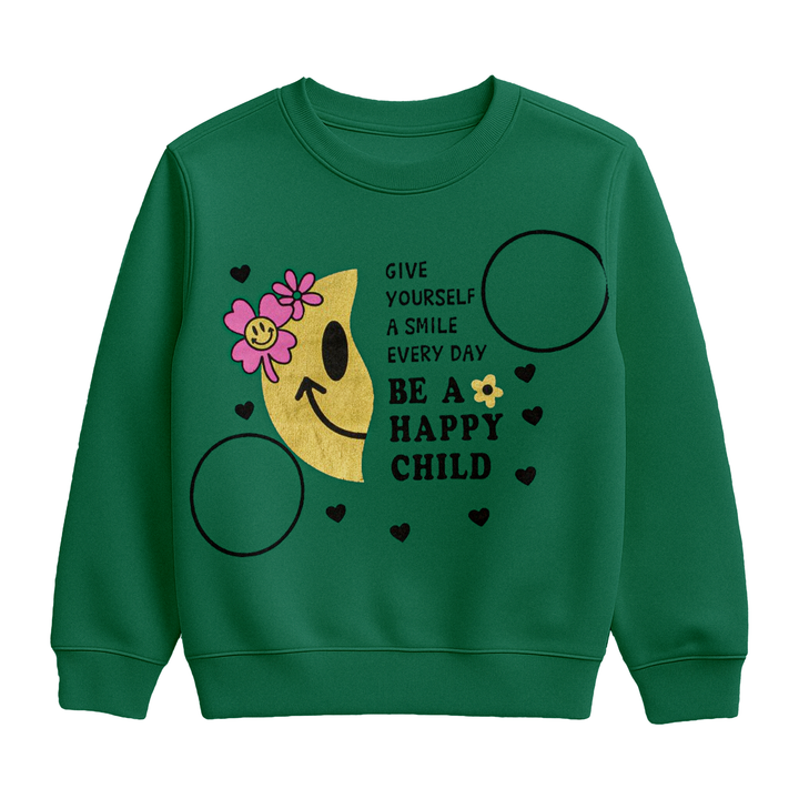 Brighten your kid’s day with this cheerful green sweatshirt featuring a smiling face and the inspiring quote “Give yourself a smile every day – Be a happy child.” Crafted from soft, warm fabric, it’s perfect for everyday wear, spreading positivity and comfort wherever they go.