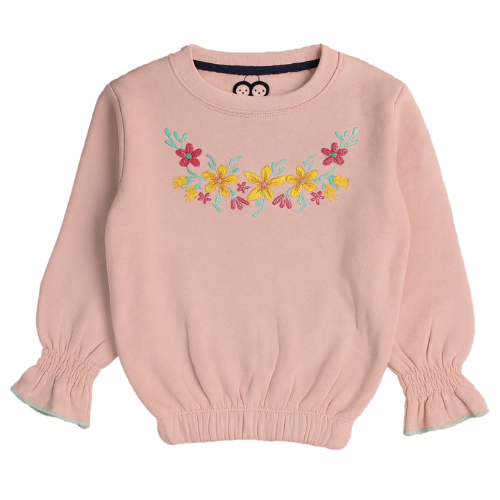 A soft peach-colored sweatshirt featuring beautifully embroidered floral patterns in vibrant yellow, pink, and aqua tones. Designed with elastic cuffs and hem for a cozy fit, this sweatshirt offers both warmth and style — perfect for casual outings or everyday wear during cooler seasons.