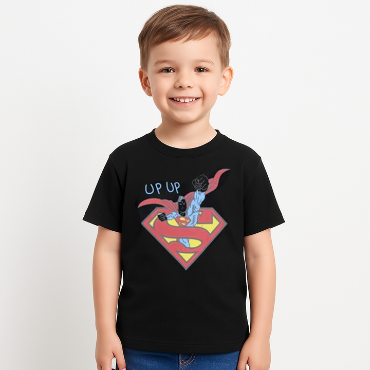 Design: Dynamic graphic of Superman flying out of his "S" shield emblem, with "UP UP" text.