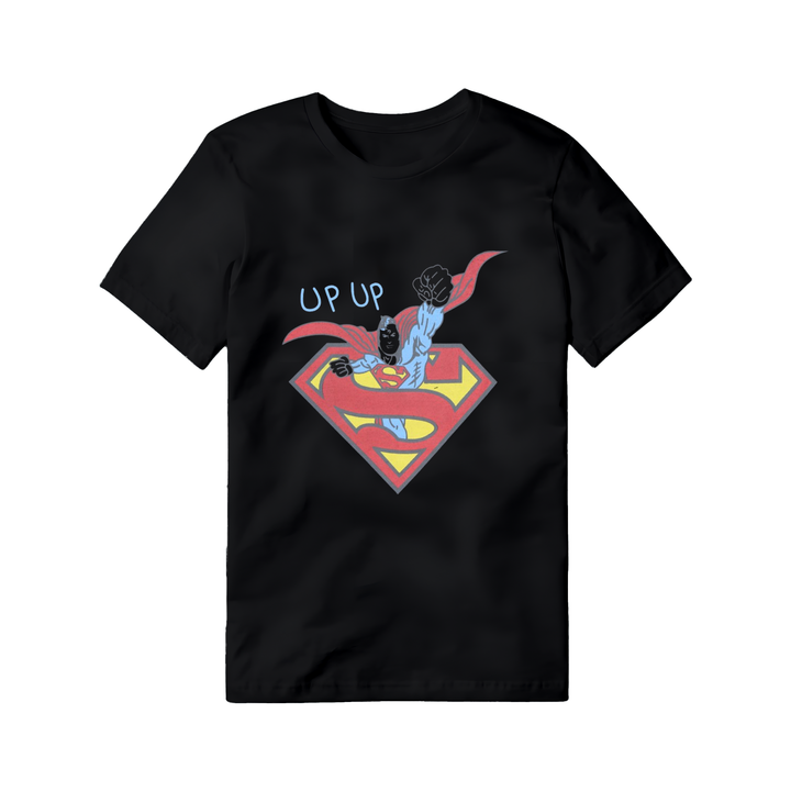 Unleash your inner hero with this bold Superman graphic T-shirt! Featuring a striking illustration of the Man of Steel in full flight, powerfully emerging from his iconic red and yellow "S" shield emblem. The classic comic book cry "UP UP" is emblazoned above, capturing the essence of his soaring adventures.