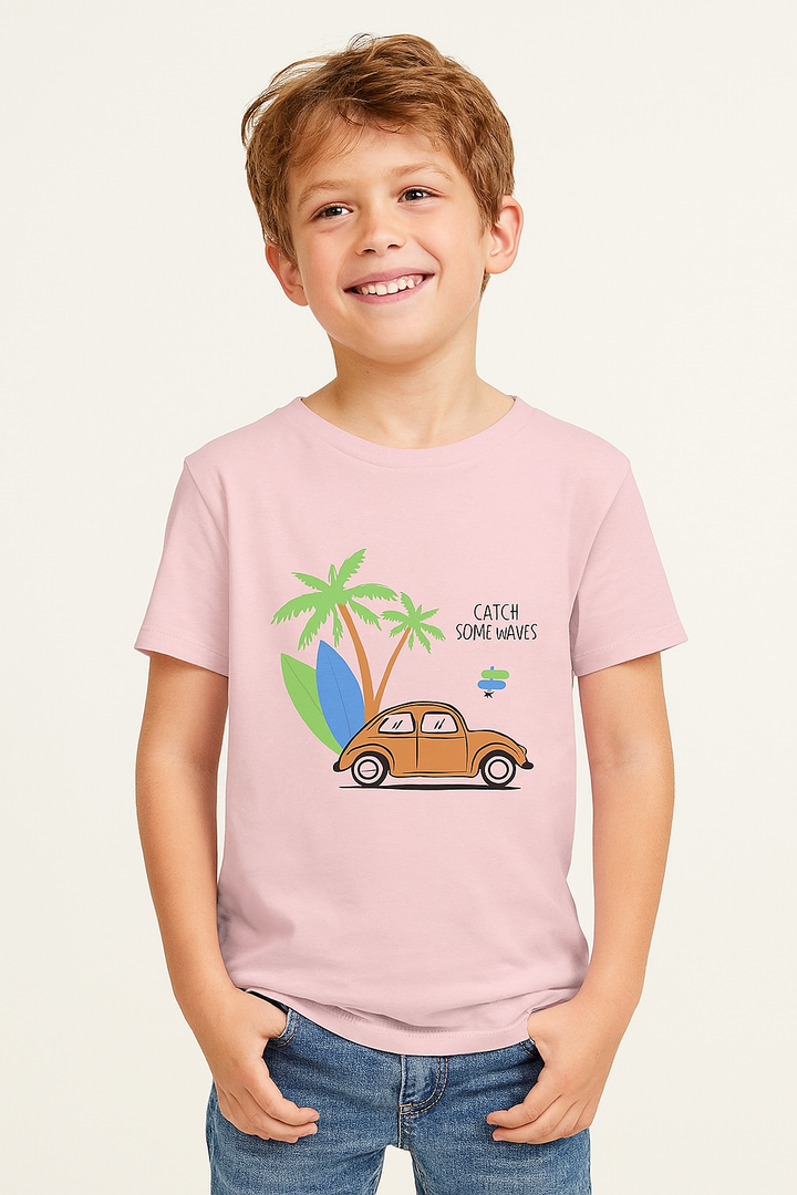 Dreaming of sandy beaches and ocean breezes? Our "Pink Paradise Surf Trip" T-Shirt is your perfect companion! This charming light pink tee features a delightful graphic of a classic brown car parked beneath swaying palm trees, with vibrant surfboards ready for the waves. The playful text "CATCH SOME WAVES" completes the idyllic scene. Made from soft, comfortable fabric, this t-shirt is ideal for anyone who loves the beach, surfing, or simply a relaxed, summery style. It's a great choice for casual outings, vacation wear, or just adding a touch of laid-back charm to your look.
