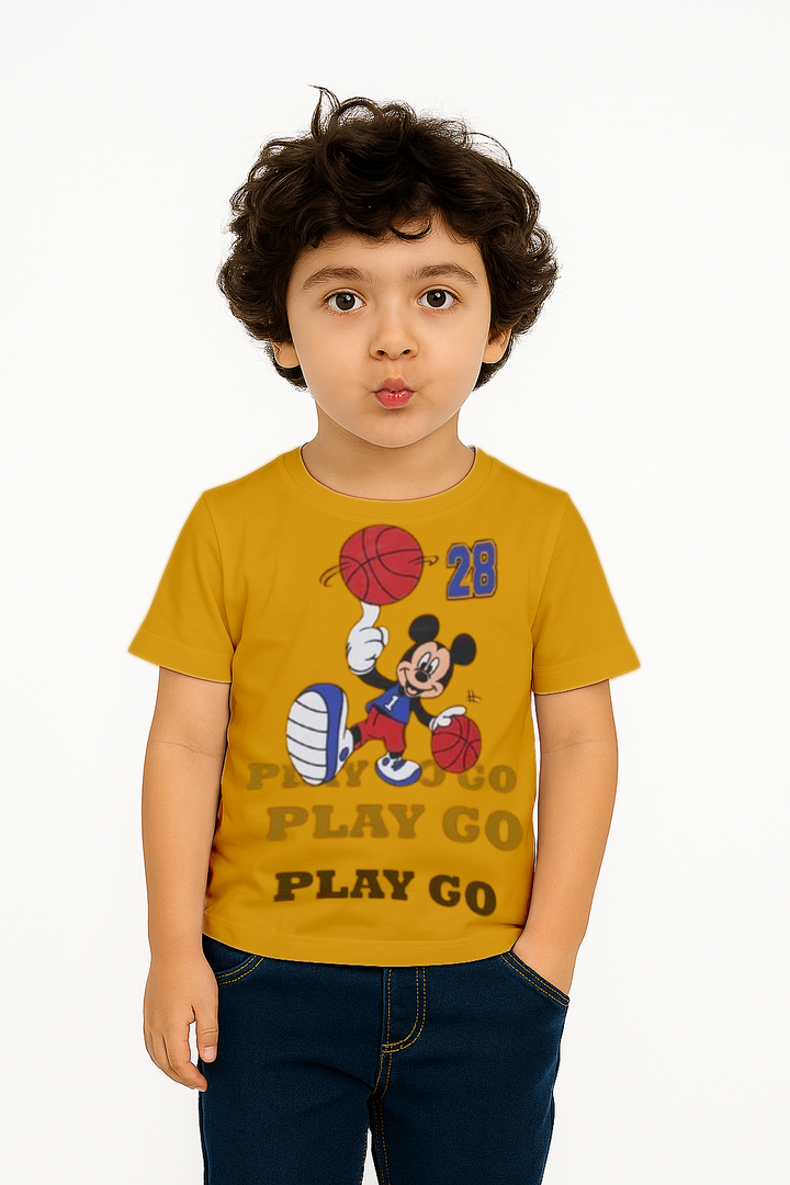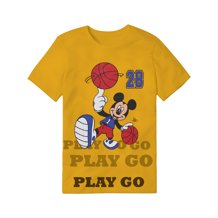 Get ready to hit the court in style with our Mickey Mouse Basketball Play Go Tee! This vibrant yellow t-shirt features everyone's favorite Disney character, Mickey Mouse, in an energetic basketball pose, dribbling two basketballs and showcasing the number "28." Below the graphic, the phrase "PLAY GO" is boldly repeated three times, emphasizing a spirit of active fun and determination.