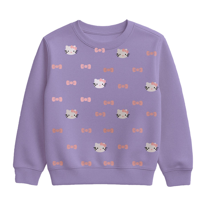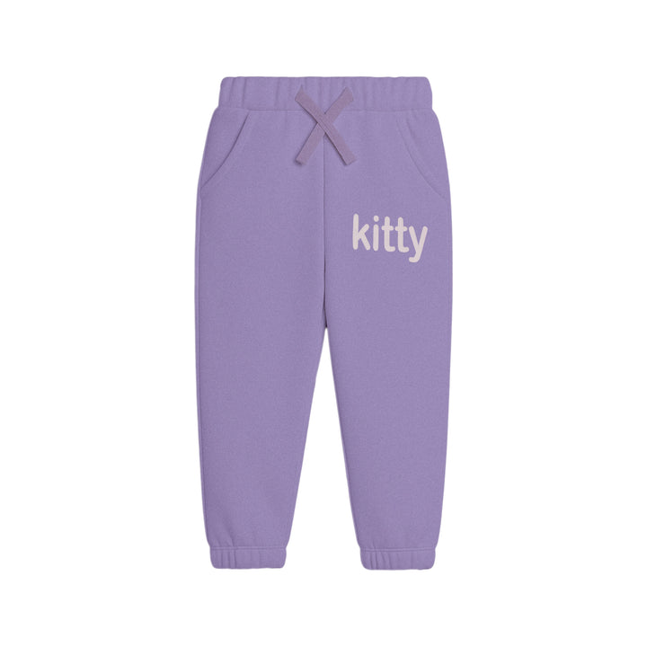 This sweet two-piece set is a light lavender or periwinkle color. The long-sleeve sweatshirt is covered in a scattered pattern of cartoon kitty faces with pink bows and alternating pink bows without the faces. The matching jogger pants have the word "kitty" printed on the left leg in a light, creamy font. The pants also include an elastic waistband with a tie and ribbed cuffs at the ankles. This comfortable and charming set is great for any cat lover.