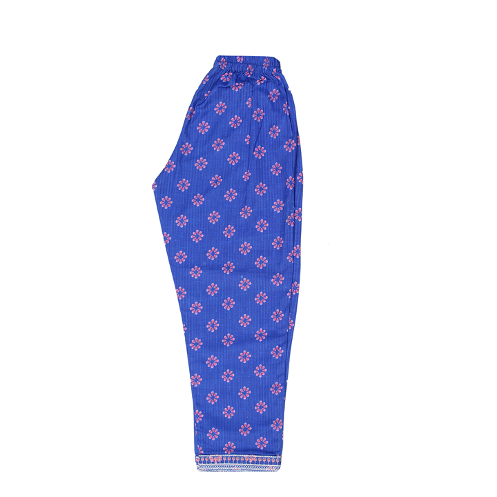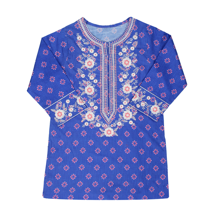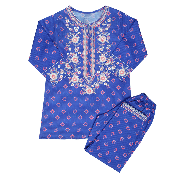Elevate your traditional wear with this stunning two-piece kids set, featuring a rich royal blue kurta (tunic) and matching shalwar. Both pieces are adorned with an all-over print of delicate pink and red floral motifs. The kurta stands out with intricate white and pink floral embroidery prominently displayed along the neckline and extending down the front placket. The sleeves also feature coordinated embroidered cuffs. The pajama pants are finished with a distinct white and blue patterned border at the hem, mirroring the details on the kurta. Made from a comfortable and soft fabric, this set is perfect for festive occasions, casual gatherings, or adding a vibrant touch to your everyday wardrobe. The classic straight-cut kurta and relaxed shalwar ensure both style and comfort.