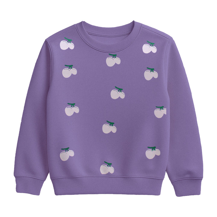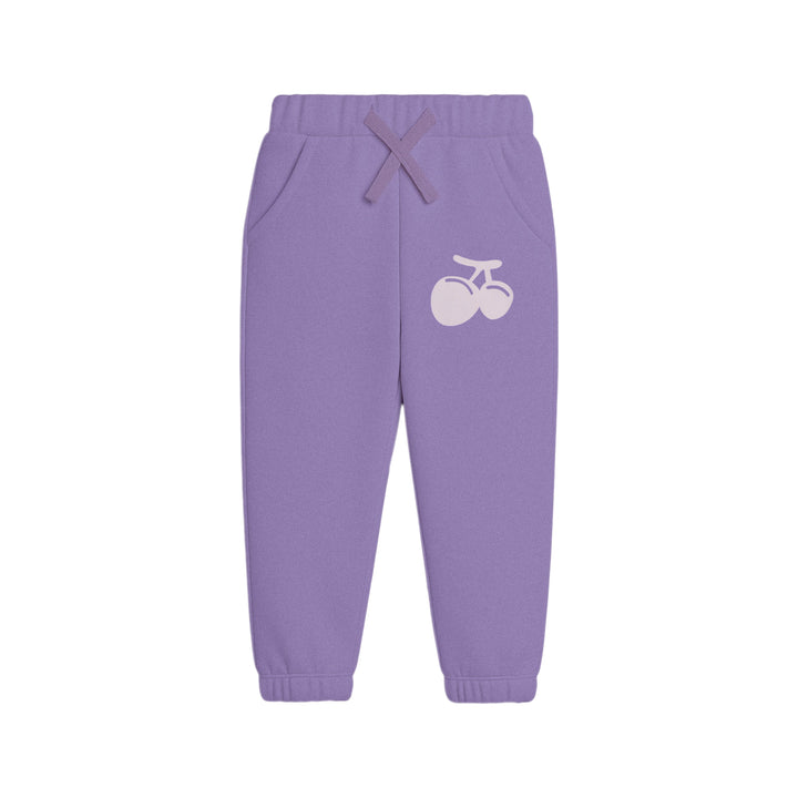 This two-piece set comes in a soft lavender color. The long-sleeve sweatshirt is covered in a scattered pattern of light-colored cherry graphics with green stems. The matching jogger pants have a single, larger cherry graphic on the left leg. The pants also include an elastic waistband with a decorative tie and ribbed cuffs at the ankles. This comfortable and sweet set is great for everyday wear.