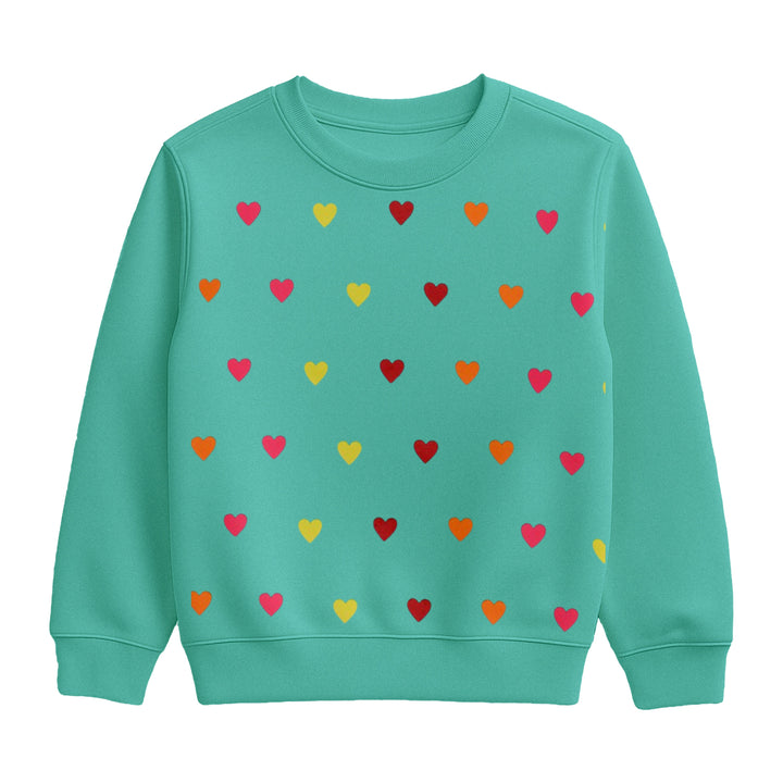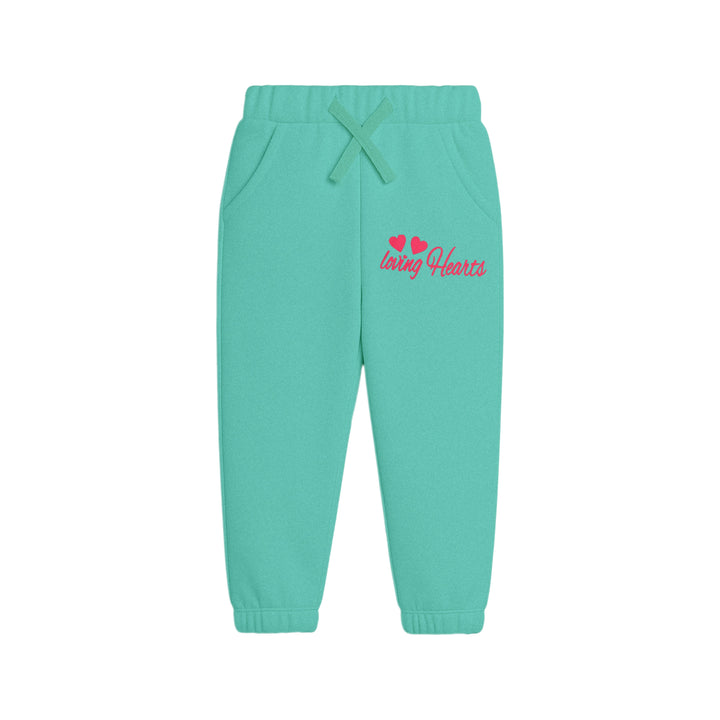 This cheerful two-piece set is a bright turquoise or seafoam green color. The long-sleeve sweatshirt is covered in a repeating pattern of multi-colored hearts in shades of pink, yellow, orange, and red. The matching jogger pants have a smaller graphic on one leg featuring two pink hearts and the phrase "loving Hearts." The pants also include an elastic waistband with a tie and ribbed cuffs at the ankles. This comfortable and sweet set is great for everyday wear.
